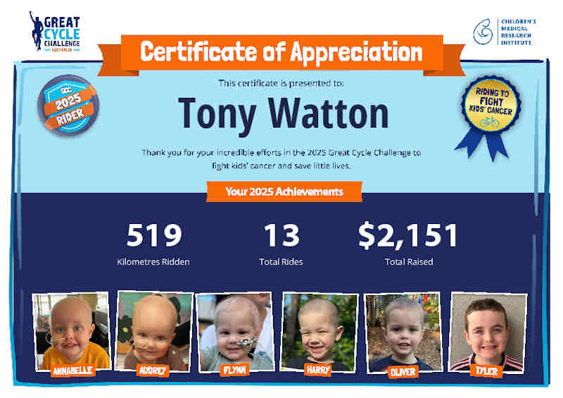 Once again, I signed up to participate in the Great Cycle Challenge. This was my fifth year of the Challenge, attempting to ride 500kms and raise $1,000 in October to help eliminate cancer in children. By the end of October I had ridden 519kms and, thanks to friends and relatives, had raised $2,151 for this worthwhile cause.