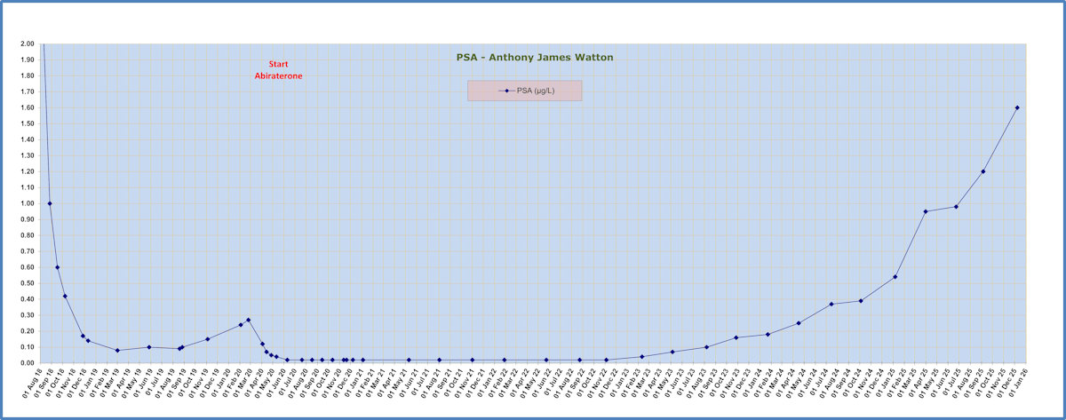 As can be seen in the chart at the start, my PSA has risen, marginally, to 0.04. The medical oncologist considered that this could be explained by the traumas that my bladder area had experienced over the past two months. It will be interesting to see the result at the next blood tests in three months time.