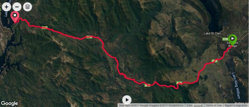 | 6 | 05/02/17 | Derwent Bridge Camp | Lake Burbury Camp | 67.8 | 7h 23m | 4h 30m | 15.0 | 58.1 |